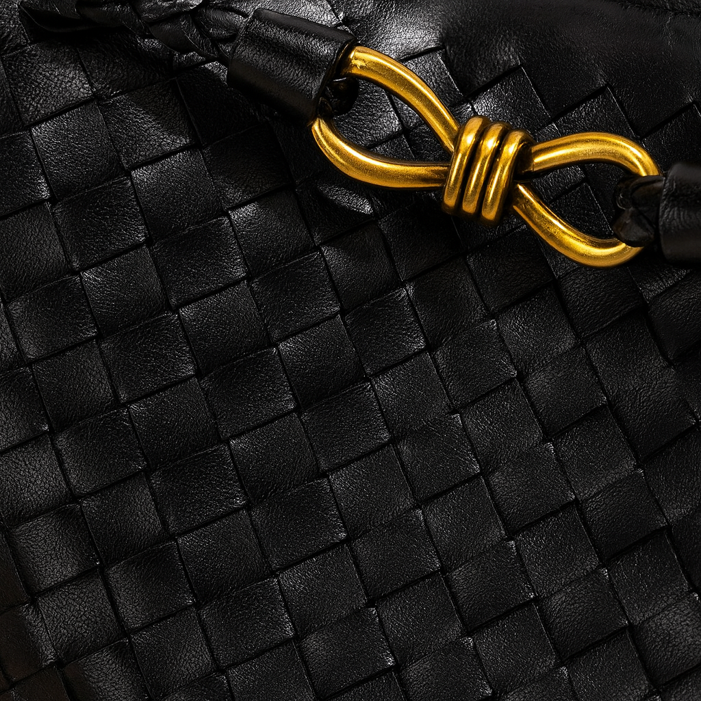 Vera is a stylish handbag made of black braided PU leather with a decorative gold detail on the front. The bag measures 25 cm in length, 9 cm in width, and 19 cm in height, with a handle adding another 8 cm. It closes with a practical magnetic clasp and is perfect for both everyday use and special occasions. A timeless bag that combines style and function.
